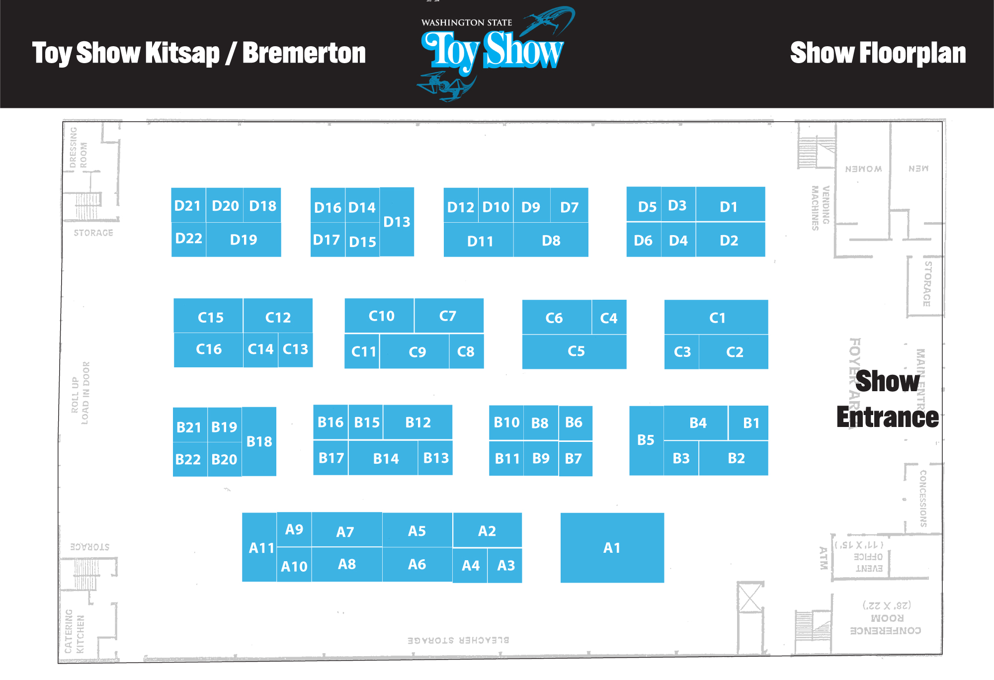 Sharing vendor space is not allowed. Priority is given to Kitsap and Jefferson County sellers, Summer Con Vendors, and vintage toy sellers. Limit three 10×10’s per seller.
